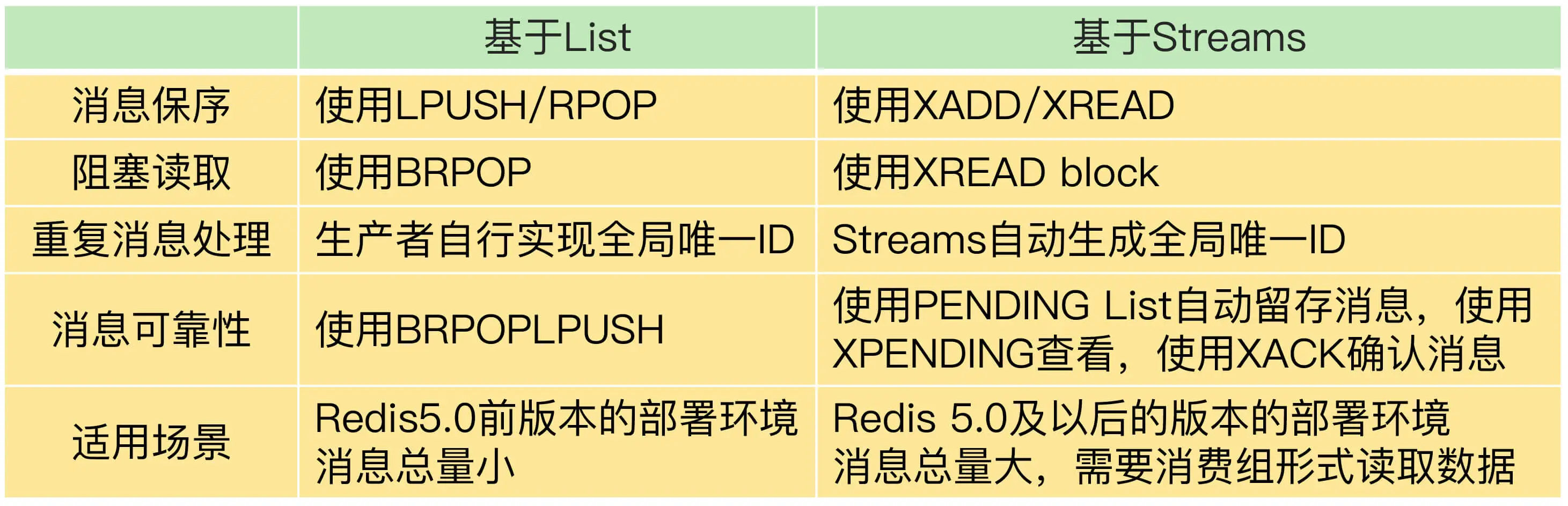 我画了一张表格,汇总了用 List 和 Streams 实现消息队列的特点和区别。当然,在实践的过程中,你也可以根据新的积累,进一步补充和完善这张表。