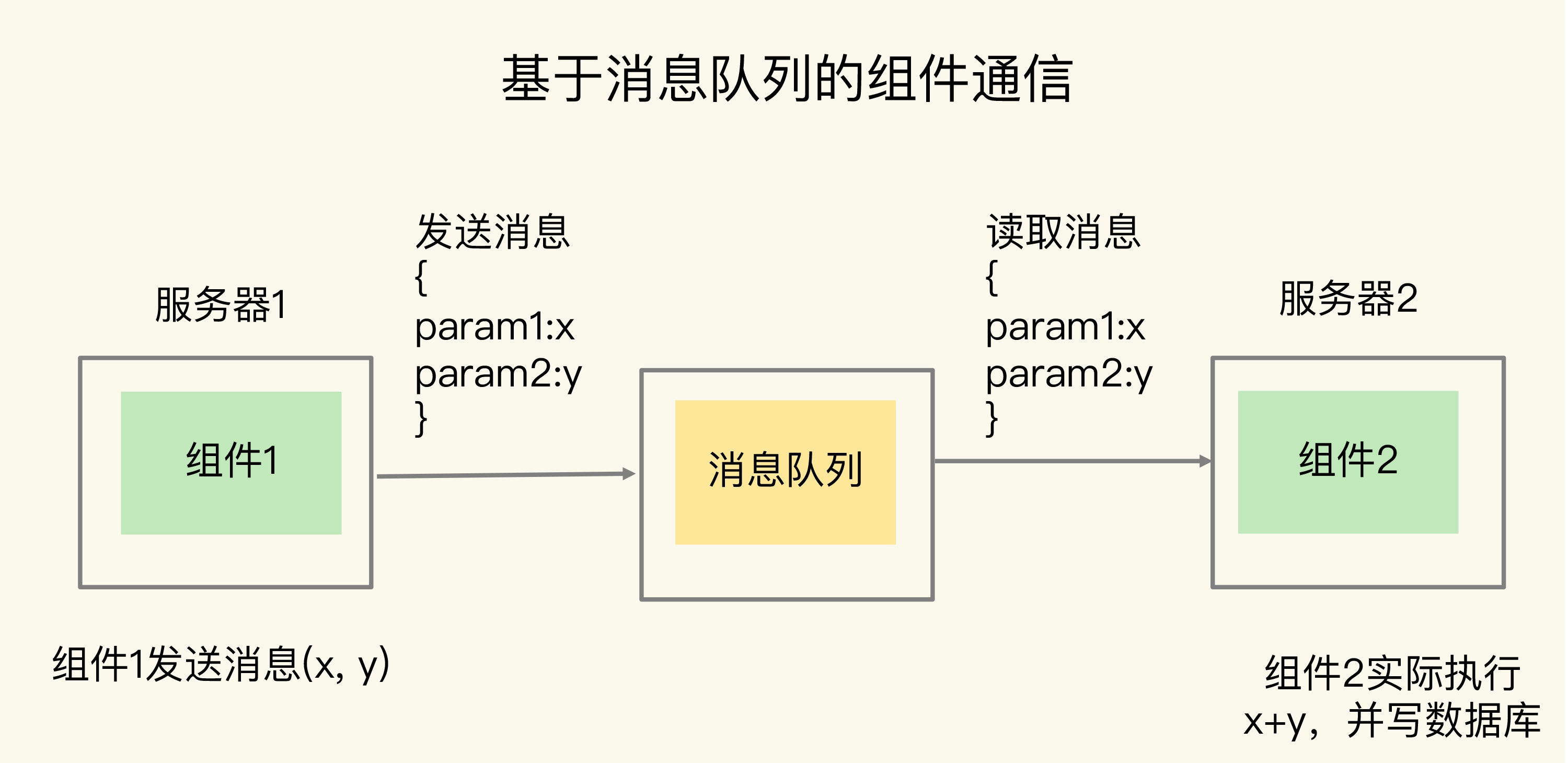 假设组件 1 需要对采集到的数据进行求和计算,并写入数据库,但是,消息到达的速度很快,组件 1 没有办法及时地既做采集,又做计算,并且写入数据库。所以,我们可以使用基于消息队列的通信,让组件 1 把数据 x 和 y 保存为 JSON 格式的消息,再发到消息队列,这样它就可以继续接收新的数据了。组件 2 则异步地从消息队列中把数据读取出来,在服务器 2 上进行求和计算后,再写入数据库。这个过程如下图所示: