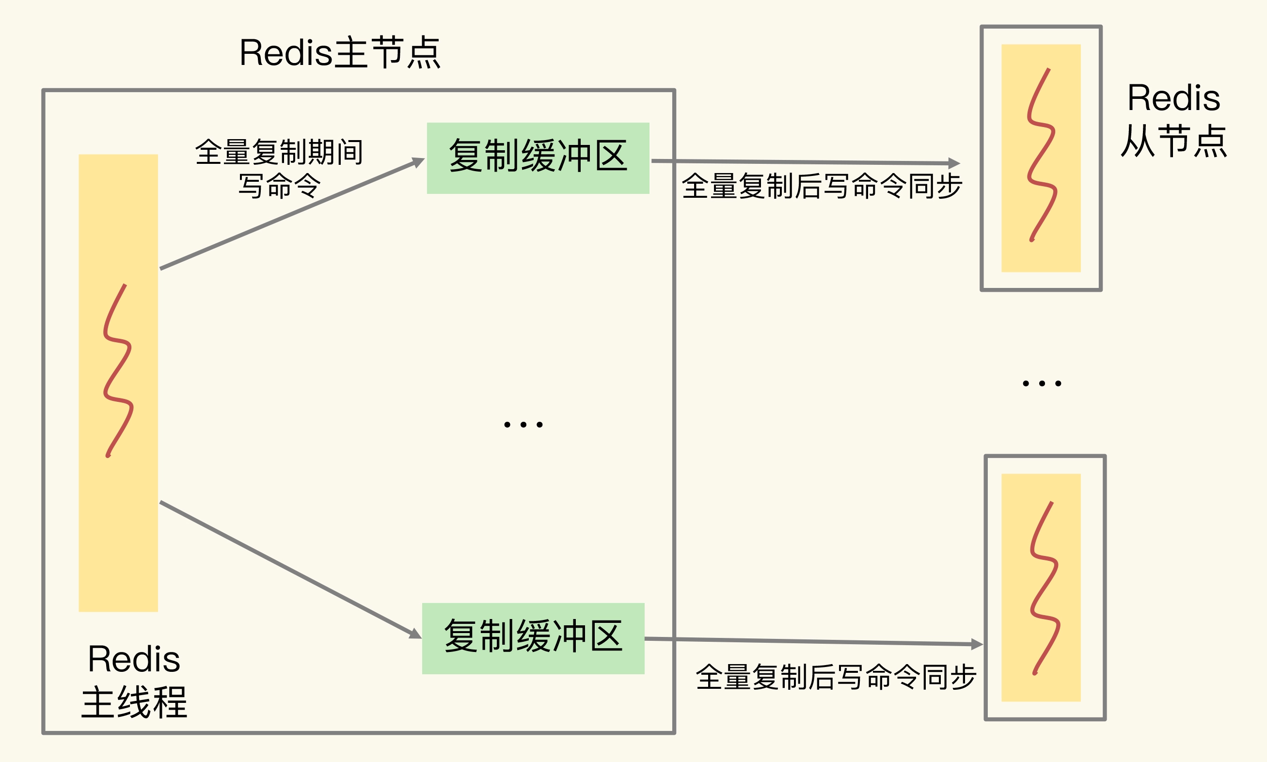 在全量复制过程中,主节点在向从节点传输 RDB 文件的同时,会继续接收客户端发送的写命令请求。这些写命令就会先保存在复制缓冲区中,等 RDB 文件传输完成后,再发送给从节点去执行。主节点上会为每个从节点都维护一个复制缓冲区,来保证主从节点间的数据同步。