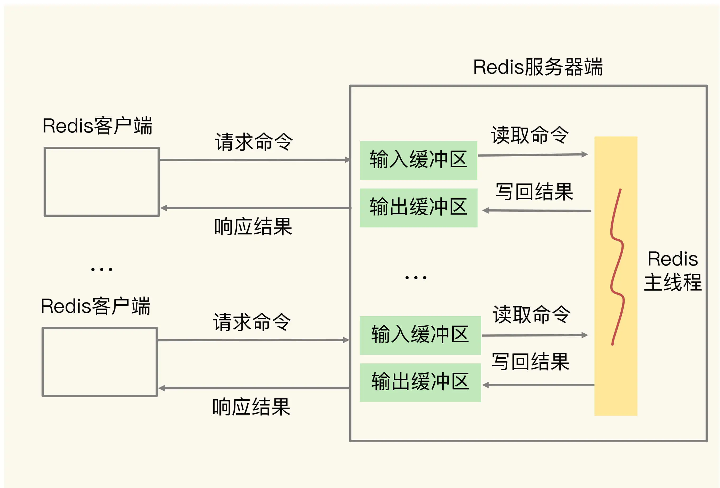 输入缓冲区会先把客户端发送过来的命令暂存起来,Redis 主线程再从输入缓冲区中读取命令,进行处理。当 Redis 主线程处理完数据后,会把结果写入到输出缓冲区,再通过输出缓冲区返回给客户端,如下图所示: