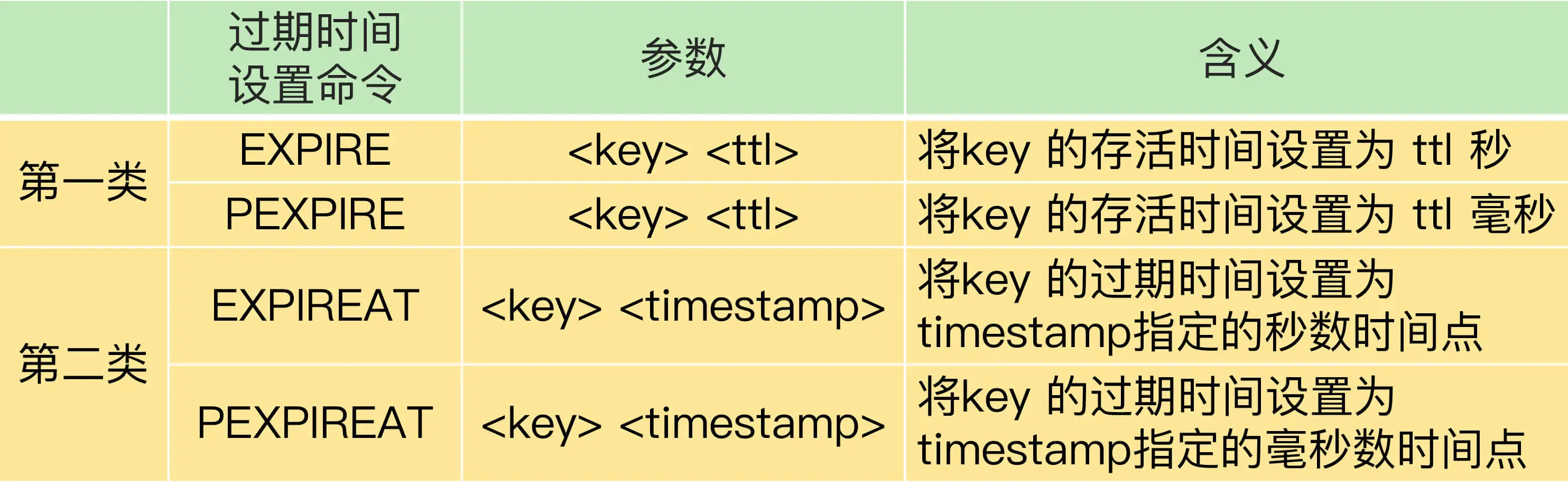 我先给你介绍下这些命令。设置数据过期时间的命令一共有 4 个,我们可以把它们分成两类: