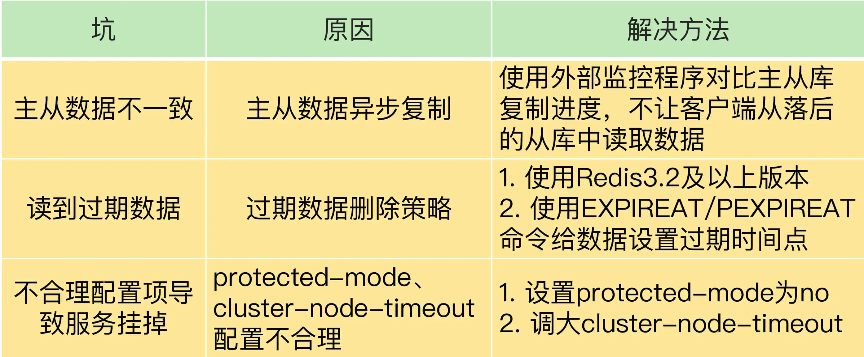 这节课,我们学习了 Redis 主从库同步时可能出现的 3 个坑,分别是主从数据不一致、读取到过期数据和不合理配置项导致服务挂掉。