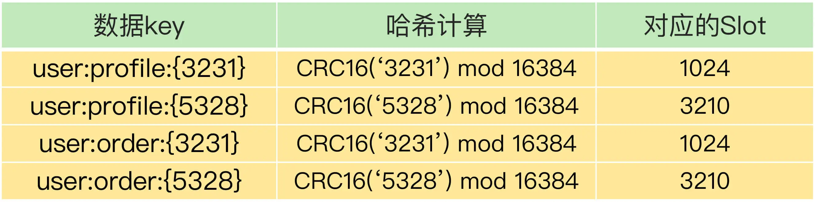 其中,user:profile:{3231}和 user:order:{3231}的 Hash Tag 一样,都是 3231,它们的 CRC16 计算值对 16384 取模后的值也是一样的,所以就对应映射到了相同的 Slot 1024 中。user:profile:{5328}和 user:order:{5328}也是相同的映射结果。