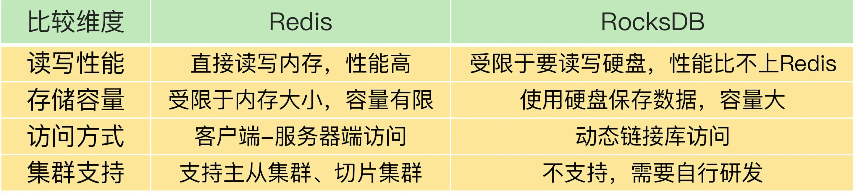 在性能方面,RocksDB 是比不上 Redis 的。而且,RocksDB 只是一个动态链接库,并没有像 Redis 那样提供了客户端 - 服务器端访问模式,以及主从集群和切片集群的功能。所以,我们在使用 RocksDB 替代 Redis 时,需要结合业务需求重点考虑替换的可行性。