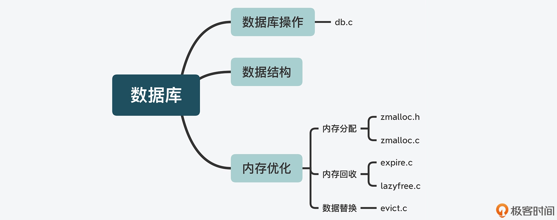 另外,在学习 Redis 功能模块的代码结构时,面对 123 个代码文件,我也给你分享了一种我一直比较推崇的方法:分门别类。也就是说,按照一定的维度将所要学习的内容进行分类描述或总结。