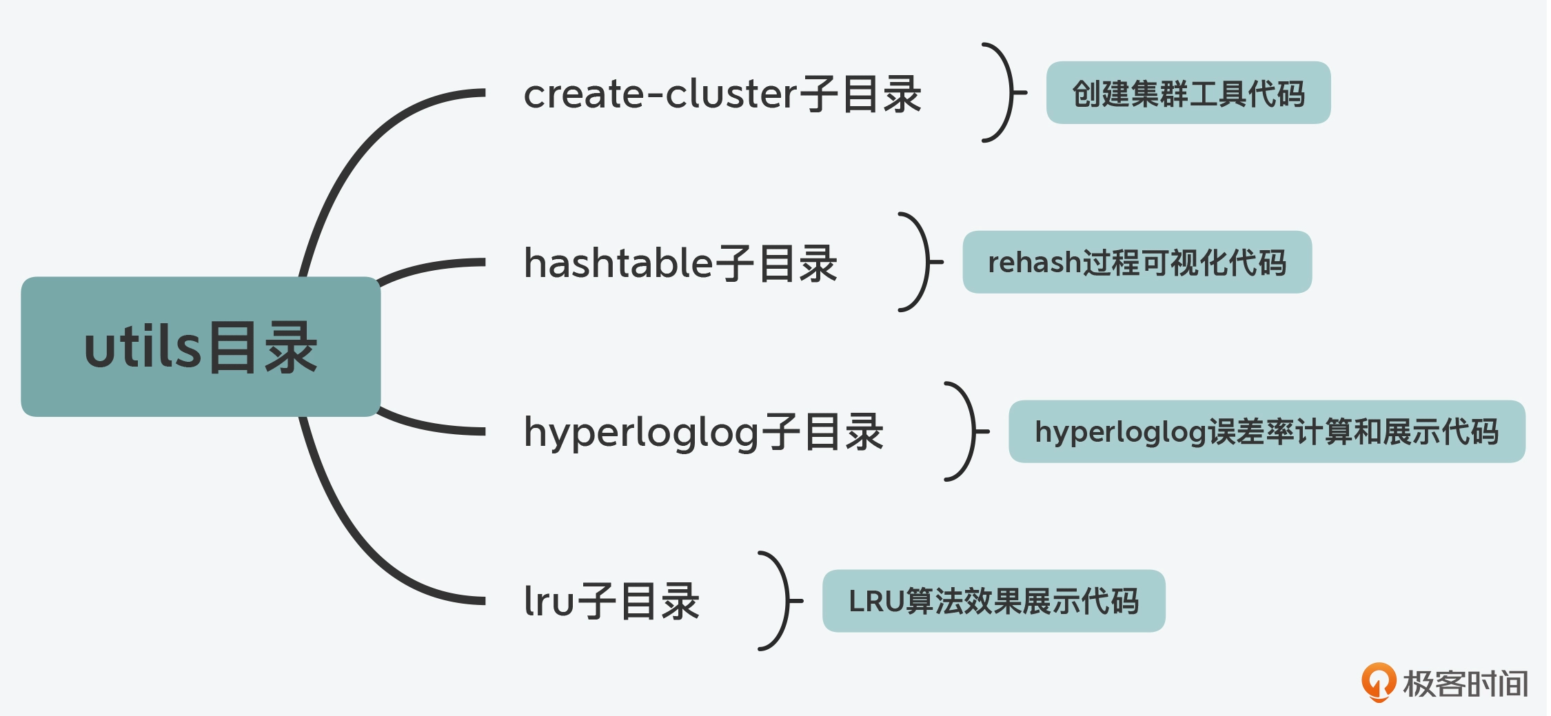 在 Redis 开发过程中,还有一些功能属于辅助性功能,包括用于创建 Redis Cluster 的脚本、用于测试 LRU 算法效果的程序,以及可视化 rehash 过程的程序。在 Redis 代码结构中,这些功能代码都被归类到了 utils 目录中统一管理。下图展示了 utils 目录下的主要子目录,你可以看下。