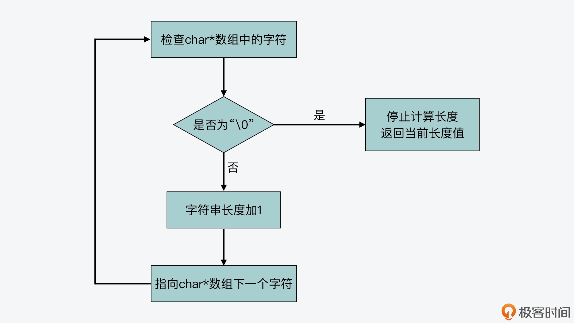 这样一来,C 语言标准库中字符串的操作函数,就会通过检查字符数组中是否有“\0”,来判断字符串是否结束。比如,strlen 函数就是一种字符串操作函数,它可以返回一个字符串的长度。这个函数会遍历字符数组中的每一个字符,并进行计数,直到检查的字符为“\0”。此时,strlen 函数会停止计数,返回已经统计到的字符个数。下图显示了 strlen 函数的执行流程: