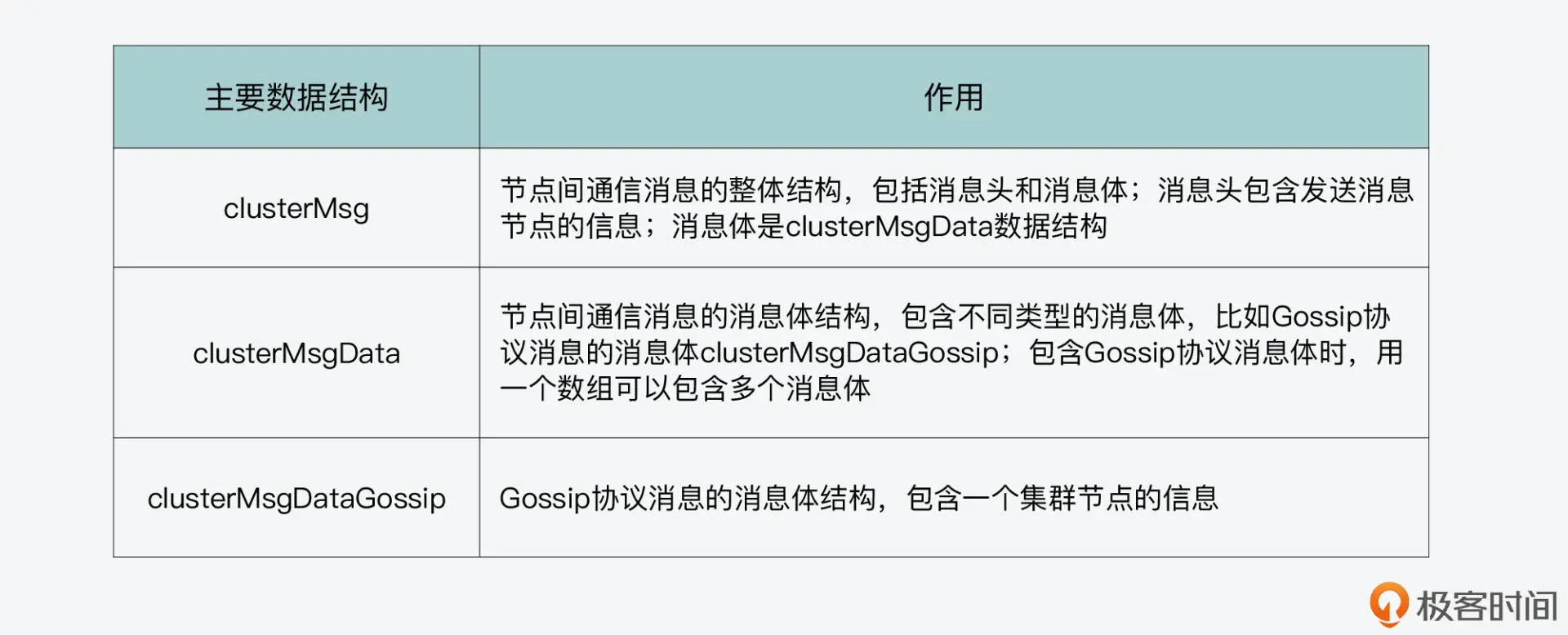 那么,Gossip 协议在通信过程中传播的 slots 分布信息,也已经在刚才介绍的 clusterMsg 数据结构中定义了。所以,Redis 使用 clusterMsg 结构体作为节点间通信的消息,就可以实现 Gossip 协议的通信目的。如果你要开发 Gossip 协议,可以参考这里 clusterMsg、clusterMsgData 和 clusterMsgDataGossip 的定义。