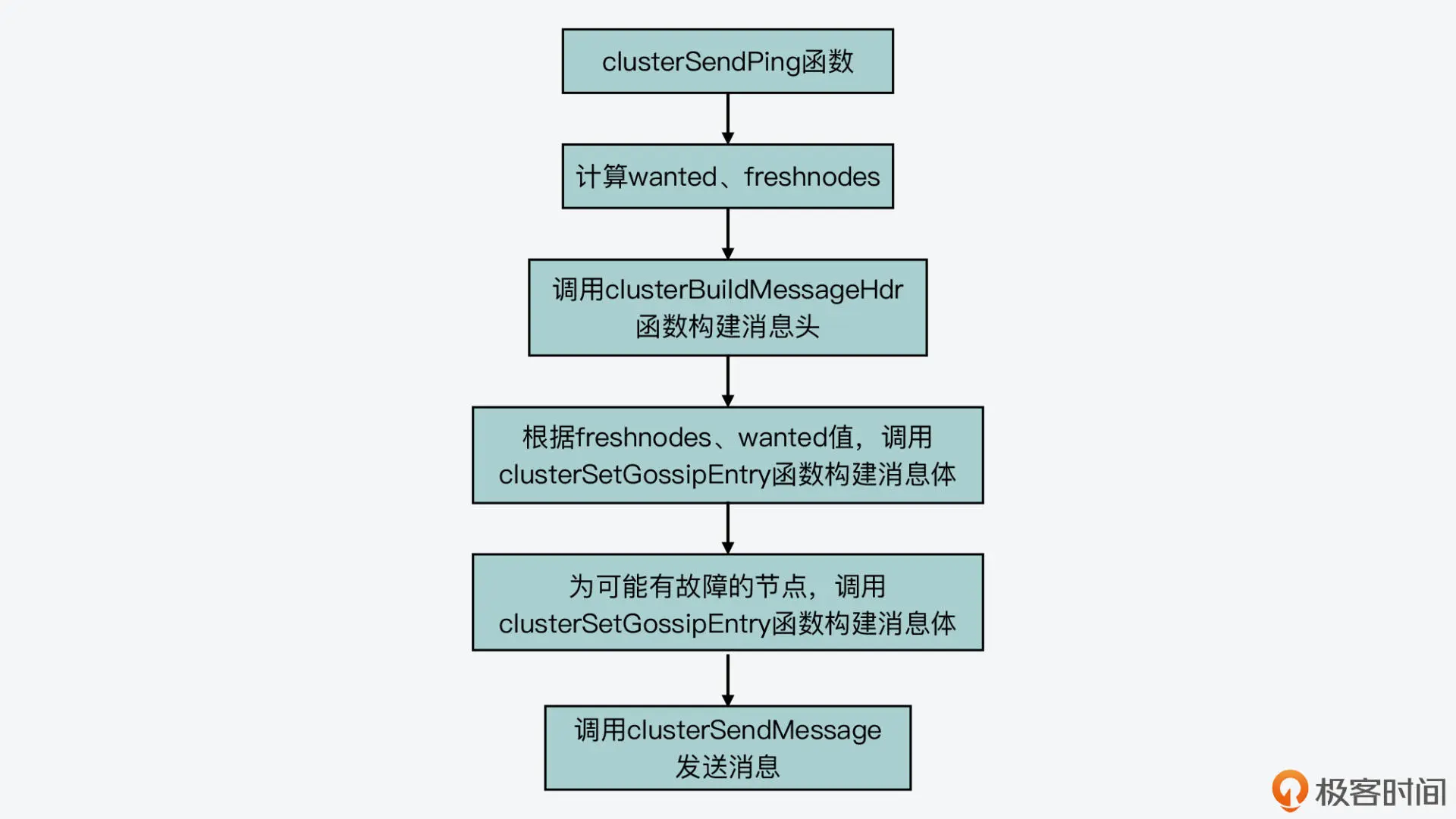 在计算完 freshnodes、wanted 和 maxiterations 这三个值的大小后,clusterSendPing 会根据这三个值的大小,执行一个循环流程,在这个循环中,它每次从集群节点中随机选一个节点出来,并调用 clusterSetGossipEntry 函数为这个节点设置相应的 Ping 消息体,也就是 clusterMsgDataGossip 结构。关于 clusterSetGossipEntry 函数对 clusterMsgDataGossip 结构的具体设置,你可以进一步看下它的源码。