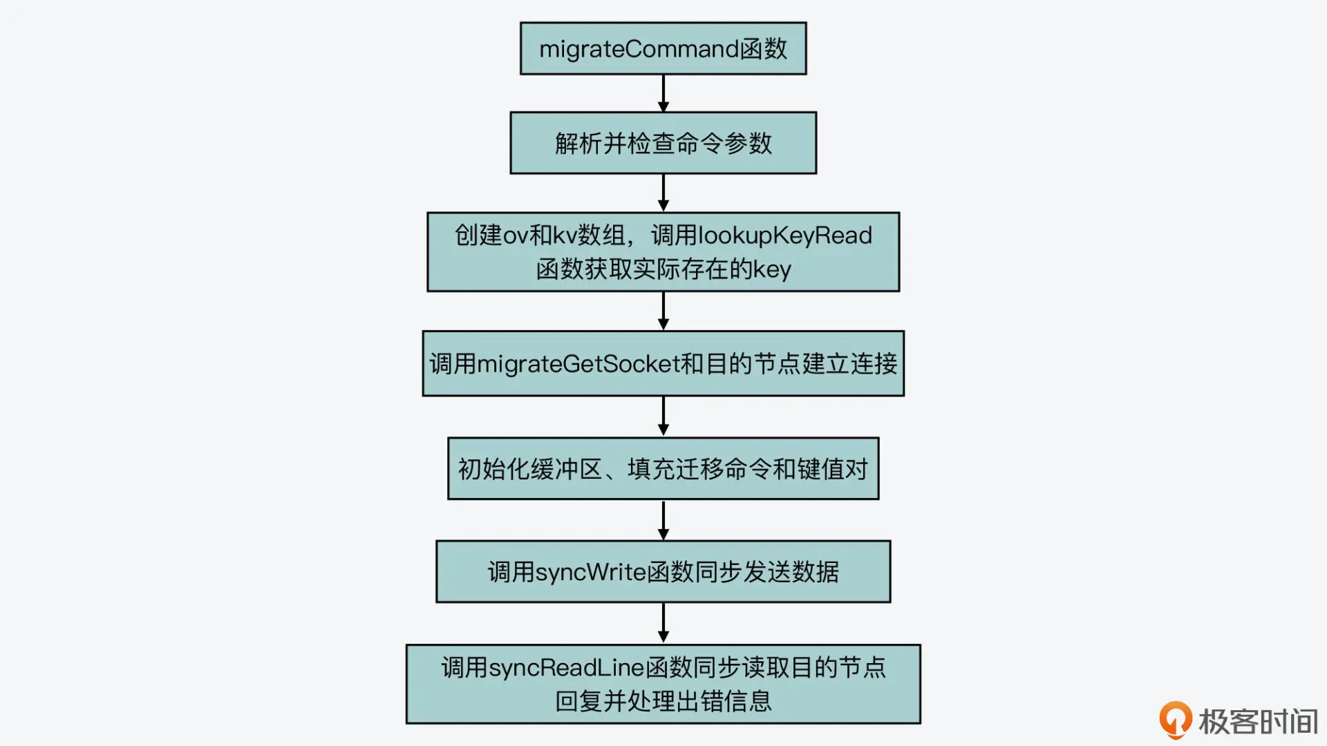 好,了解了 MIGRATE 命令的含义后,我们就来看下 migrateCommand 函数的基本处理流程,这个函数的执行过程主要可以分成四步。