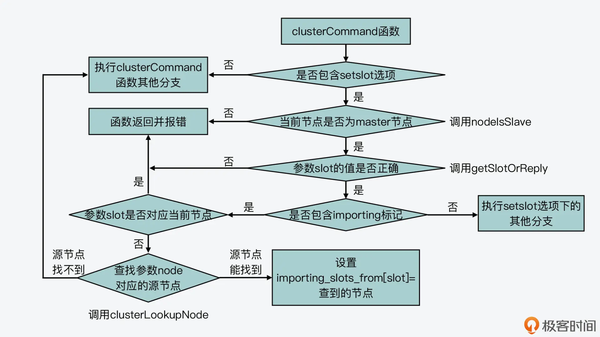 这里,我们来看一下处理 migrating 和 importing 标记的具体逻辑。其实,clusterCommand 函数对这两个标记的处理逻辑基本都是分成三步。