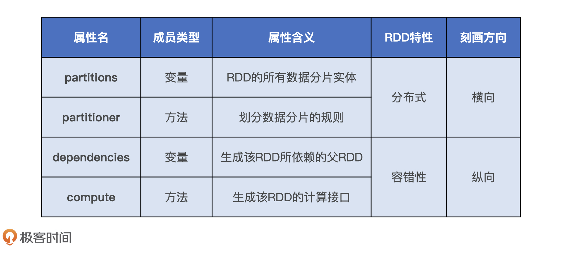 由此可见,dependencies属性和compute属性负责RDD在纵深方向上的延展,因此我们不妨把这两个属性称为“纵向属性”。