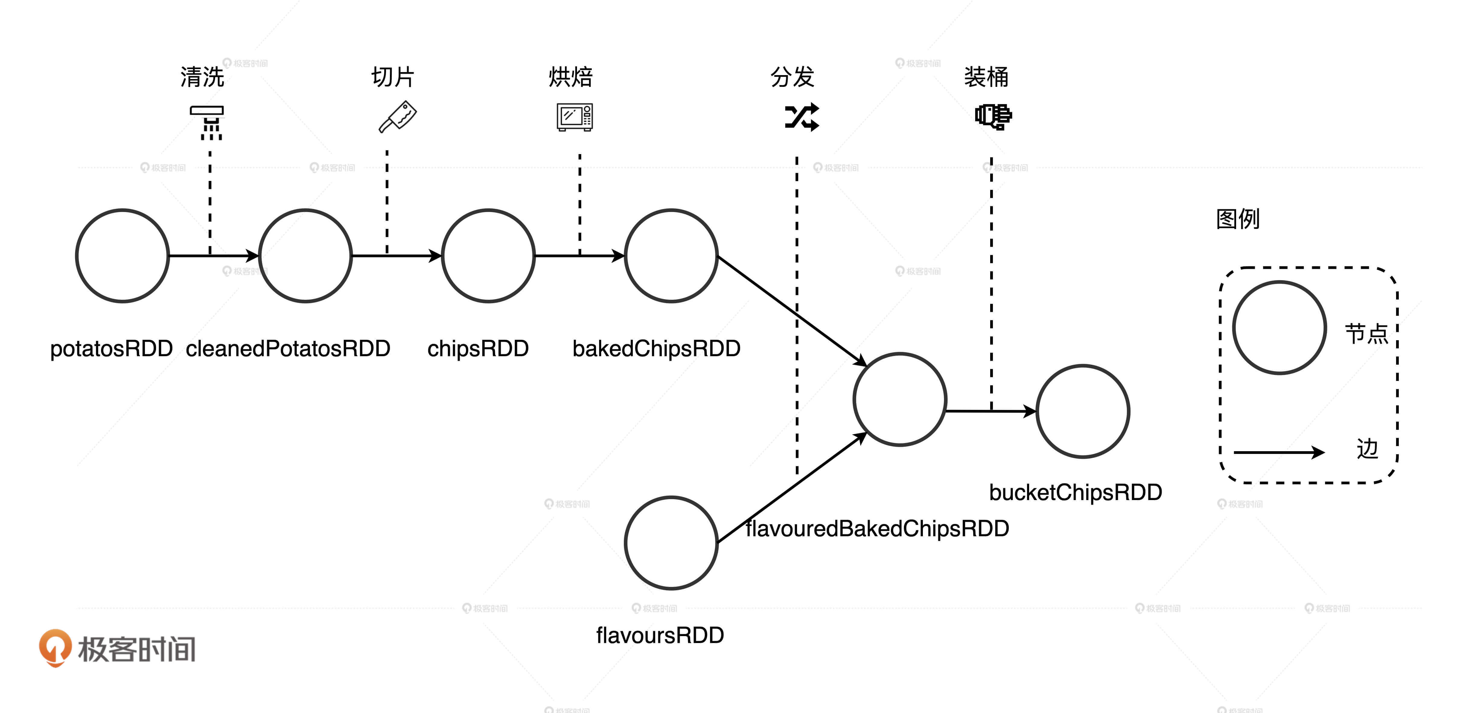 因为DAG中的每一个顶点都由RDD构成,对应到上图中就是带泥的土豆potatosRDD,清洗过的土豆cleanedPotatosRDD,以及调料粉flavoursRDD等等。DAG的边则标记了不同RDD之间的依赖与转换关系。很明显,上图中DAG的每一条边都有指向性,而且整张图不存在环结构。