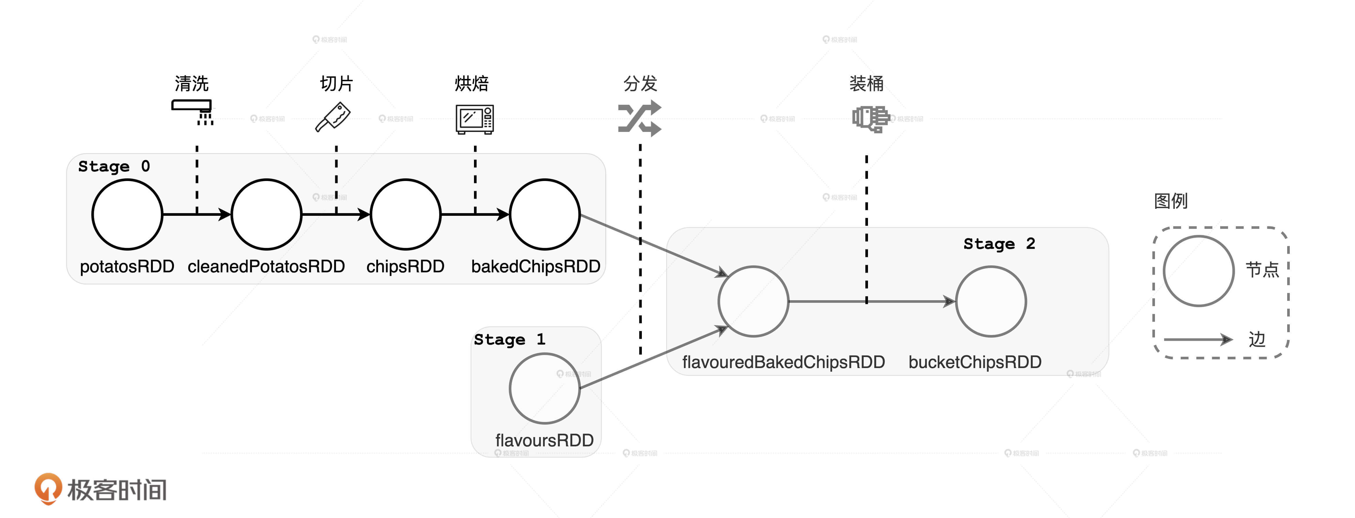 不过,改造流水线可是个大工程,为了让改装工人能够高效协作,工头儿得把上面的改造设想抽象成一张施工流程图。有了这张蓝图,工头儿才能给负责改装的工人们分工,大伙儿才能拧成一股绳、劲儿往一处使。在上一讲中,我们把食材形态类比成RDD,把相邻食材形态的关系看作是RDD间的依赖,那么显然,流水线的施工流程图就是DAG。