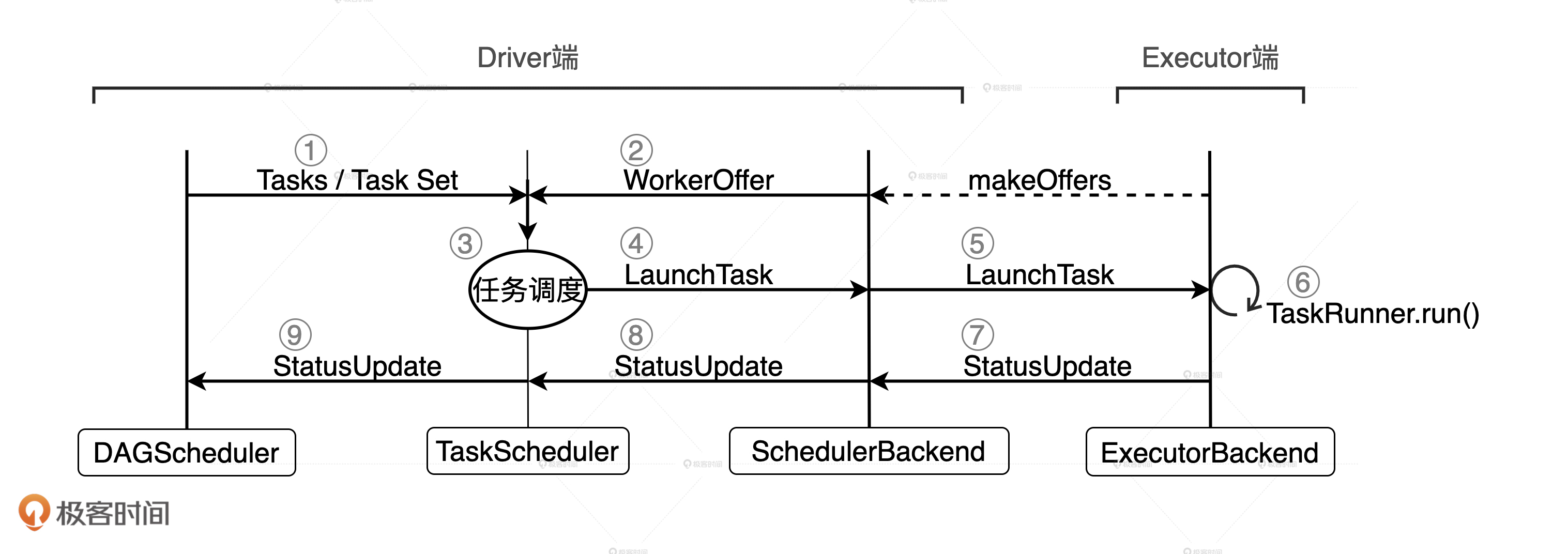 接下来,我们深入到流程中的每一步去探究Spark调度系统是如何工作的。不过在此之前,我们得先弄清楚调度系统都包含哪些关键组件,不同组件之间如何交互,它们分别担任了什么角色,才能更好地理解流程中的每一步。