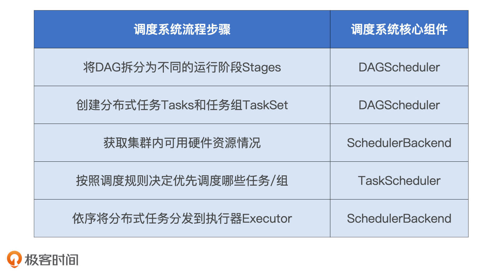 Spark调度系统包含3个核心组件,分别是DAGScheduler、TaskScheduler和SchedulerBackend。这3个组件都运行在Driver进程中,它们通力合作将用户构建的DAG转化为分布式任务,再把这些任务分发给集群中的Executors去执行。不过,它们的名字都包含Scheduler,光看名字还真是丈二和尚摸不着头脑,所以我把它们和调度系统流程中5个步骤的对应关系总结在了下表中,你可以看一看。