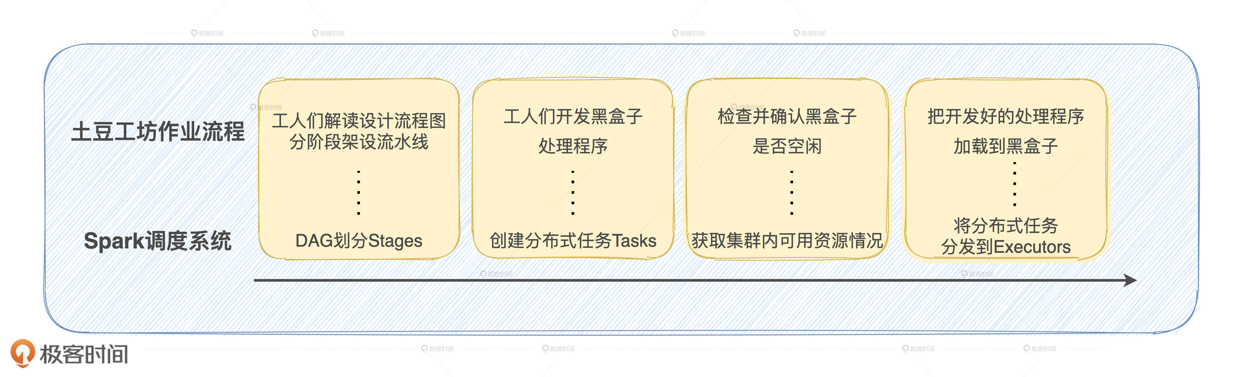 Spark调度系统的核心职责是,先将用户构建的DAG转化为分布式任务,结合分布式集群资源的可用性,基于调度规则依序把分布式任务分发到执行器。这个过程听上去就够复杂的了,为了方便你理解,我们还是先来讲一个小故事。