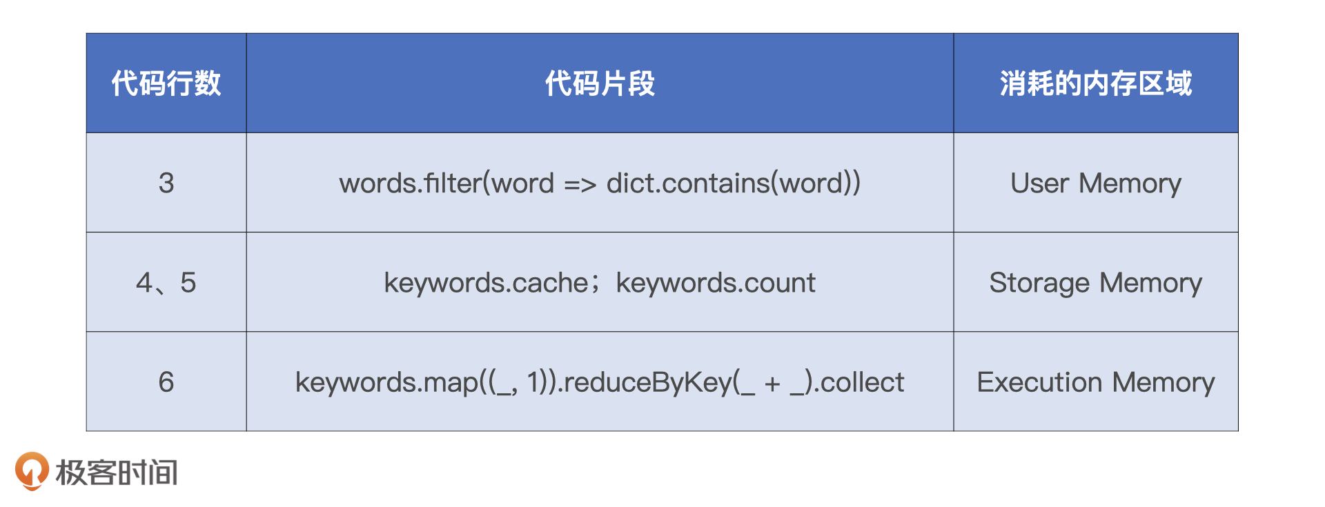 同时,我也把这个例子中的关键内容和Spark之间的对应关系总结在了下面,希望能帮助你加深印象。