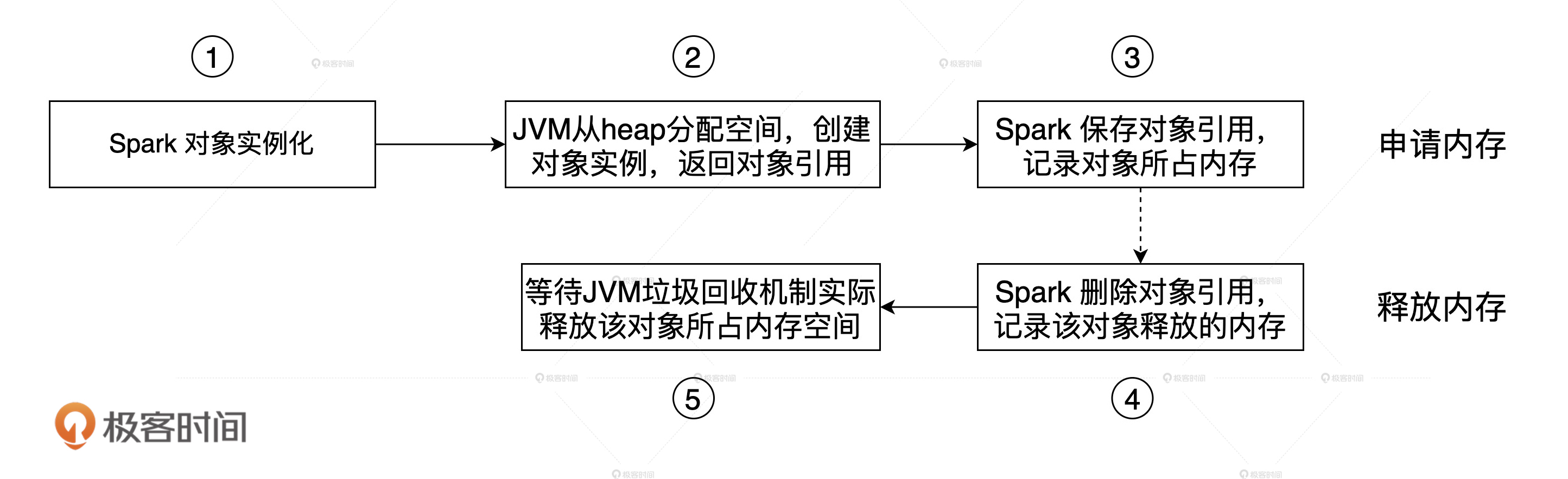 其中,堆内内存的申请与释放统一由JVM代劳。比如说,Spark需要内存来实例化对象,JVM负责从堆内分配空间并创建对象,然后把对象的引用返回,最后由Spark保存引用,同时记录内存消耗。反过来也是一样,Spark申请删除对象会同时记录可用内存,JVM负责把这样的对象标记为“待删除”,然后再通过垃圾回收(Garbage Collection,GC)机制将对象清除并真正释放内存。