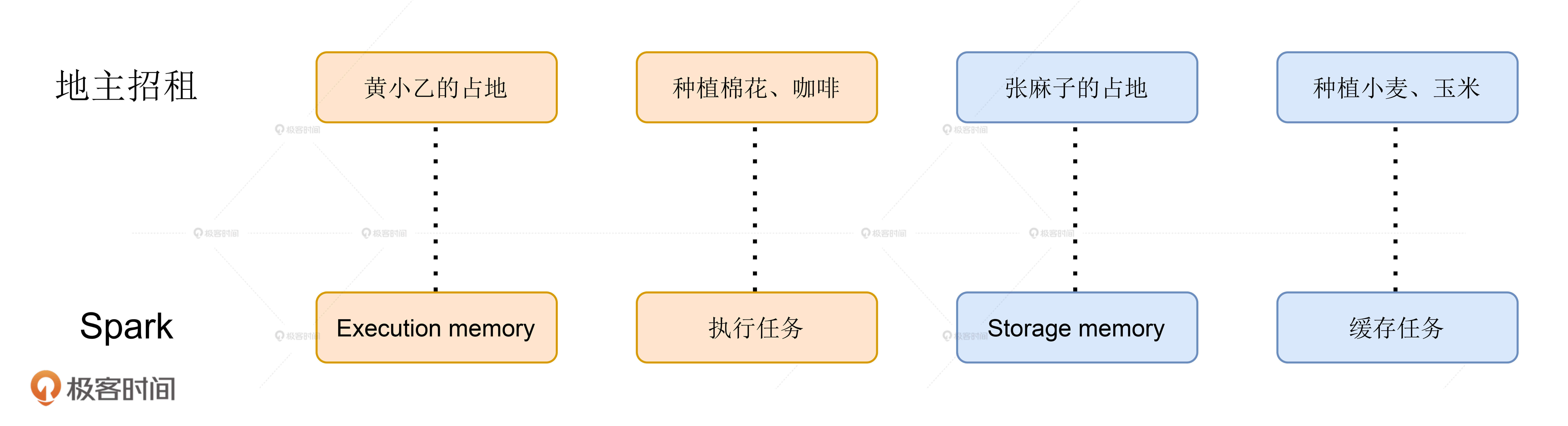 不过,即使执行任务的抢占优先级更高,但它们在抢占内存的时候一定也要遵循某些规则。那么,这些规则具体是什么呢?下面,咱们就接着以地主招租的故事为例,来说说Execution memory和Storage memory之间有哪些有趣的规则。