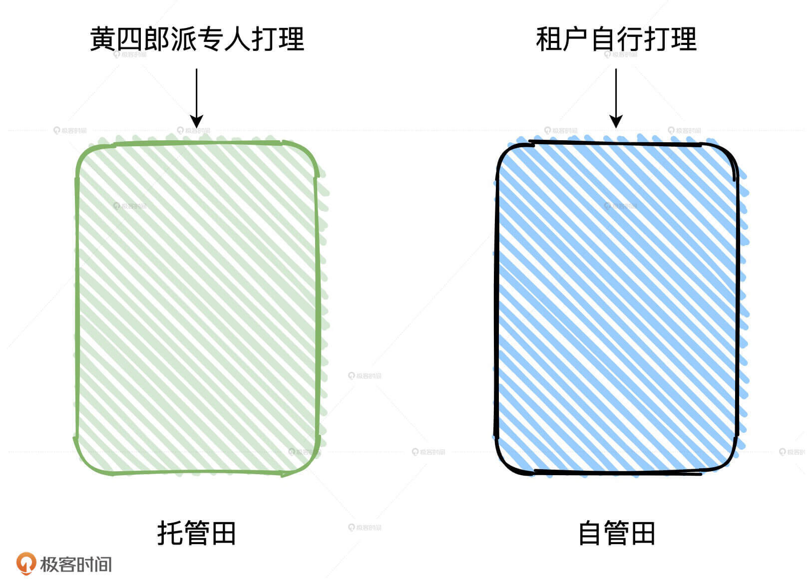 我们知道,庄稼丰收之后,田地需要翻土、整平、晾晒,来年才能种下一茬庄稼。那么,托管田指的就是丰收之后,由黄四郎派专人帮你搞定翻土、整平这些琐事,不用你操心。相应的,自管田的意思就是庄稼你自己种,秋收之后的田地也得你自己收拾。
