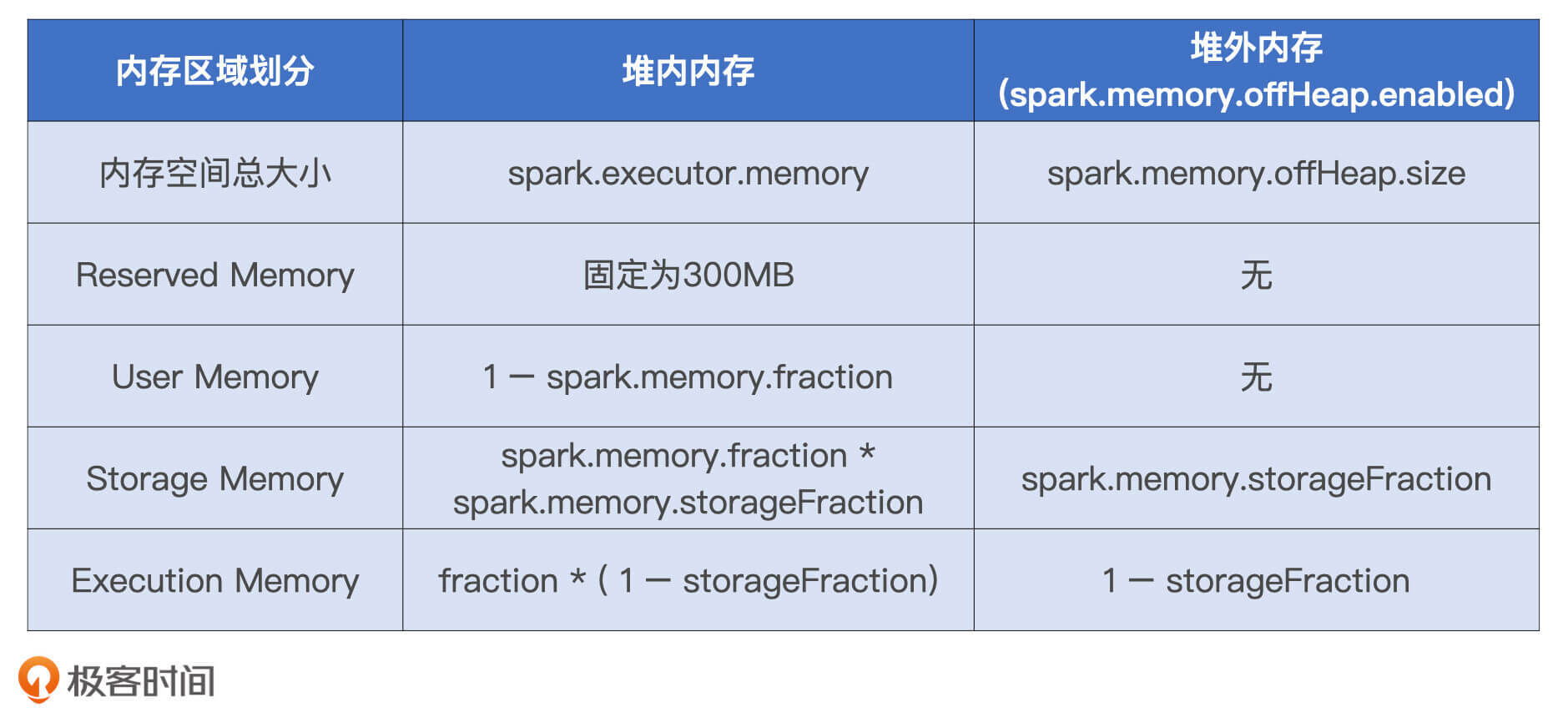 堆外内存则不同,Spark通过调用Unsafe的allocateMemory和freeMemory方法直接在操作系统内存中申请、释放内存空间,这听上去是不是和C++管理内存的方式很像呢?这样的内存管理方式自然不再需要垃圾回收机制,也就免去了它带来的频繁扫描和回收引入的性能开销。更重要的是,空间的申请与释放可以精确计算,因此Spark对堆外可用内存的估算会更精确,对内存的利用率也更有把握。