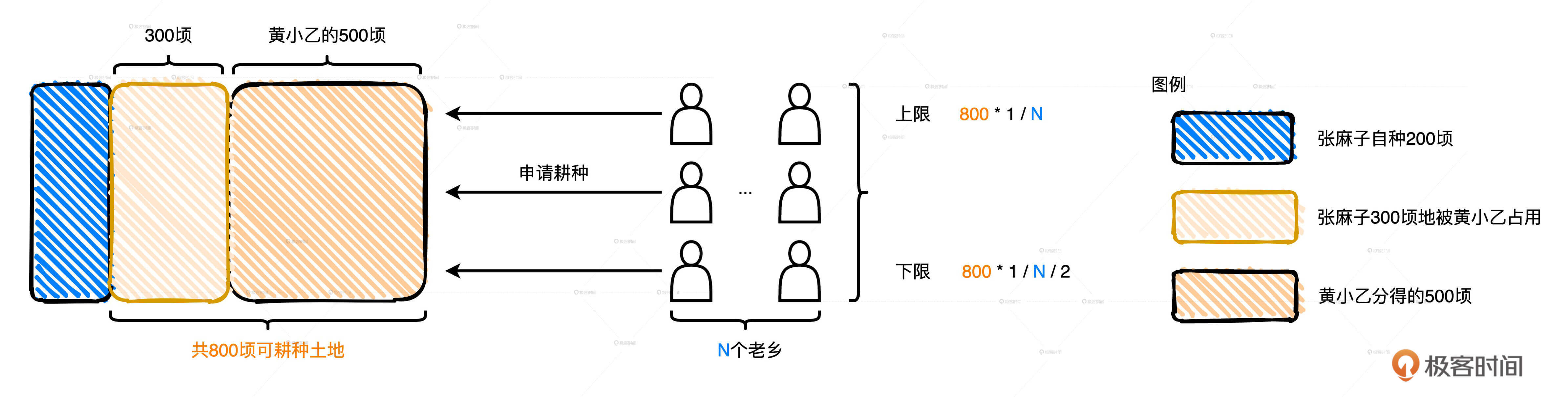 比如说,现阶段可耕种土地总面积已由500顷扩张为800顷(这是黄小乙就抢占了张麻子的地之后的土地总面积),如果有400位老乡申请土地转让权,那么每位老乡最高可得2顷(800/400)的土地,最低可得1顷(800/400/2)土地。也就是说,如果老乡人数为N,那么每位老乡能够获得的土地面积会在(1/N/2,1/N)之间浮动。