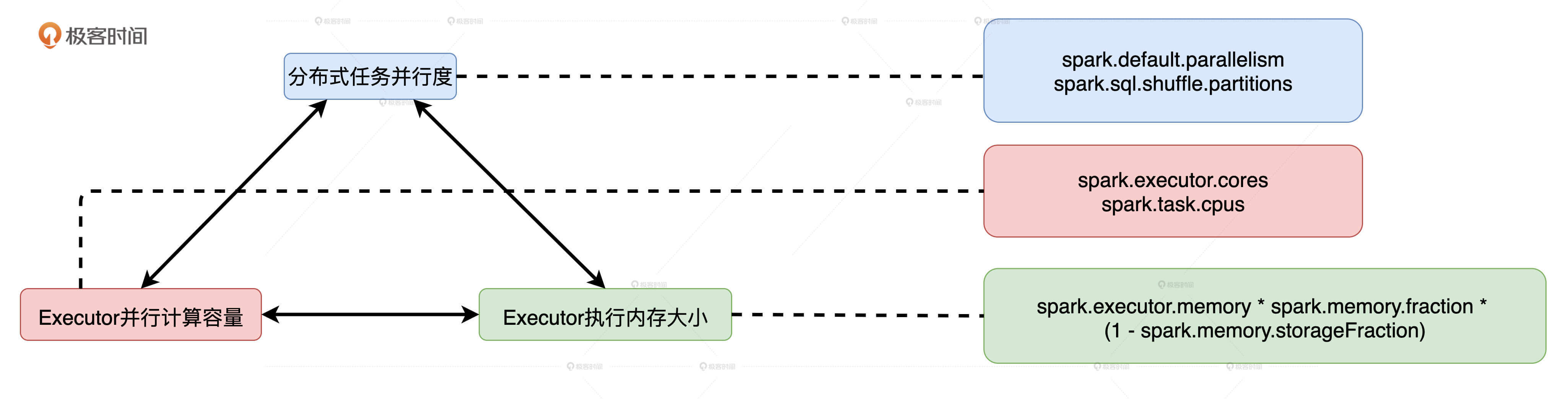 理清了线程与执行内存的关系之后,我们再来说说与并发度、执行内存和并行度这三者对应的3类配置项分别是什么,以及它们如何影响CPU与计算内存之间的平衡。