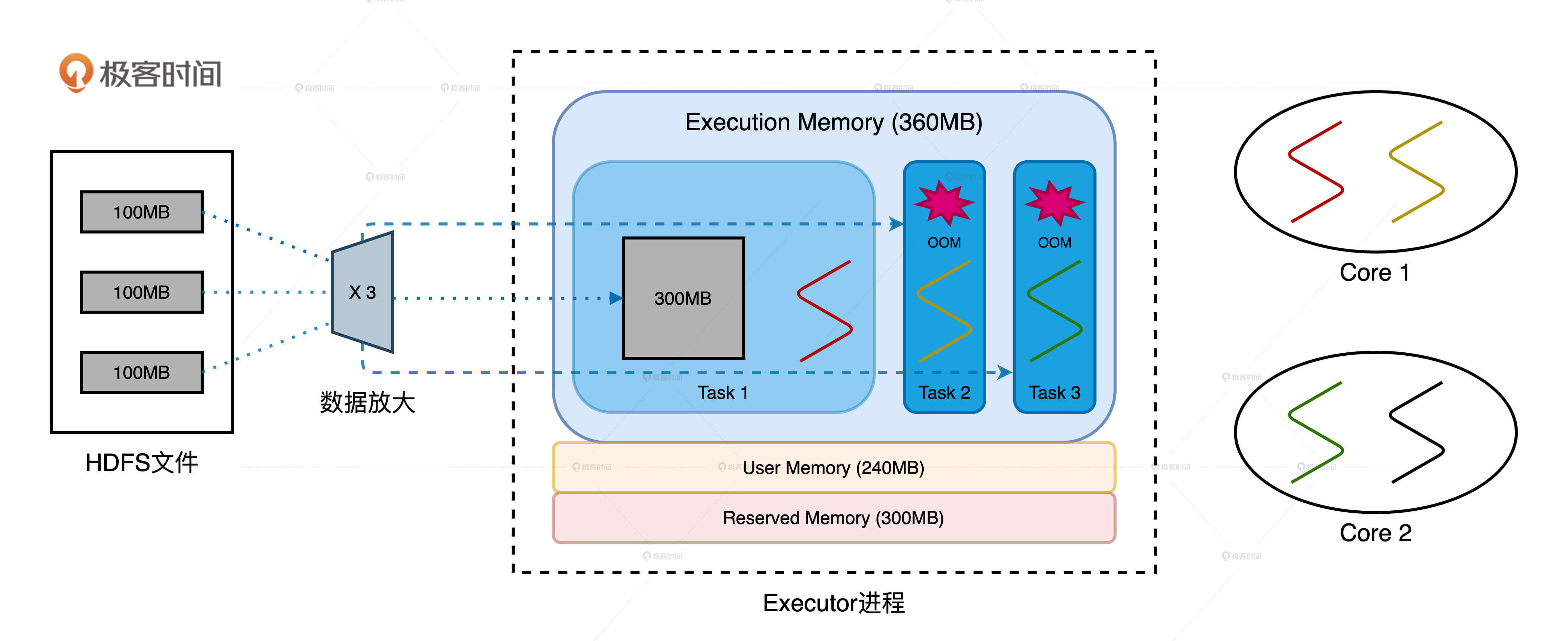 1. 数据膨胀导致OOM的例子中,为什么Task1能获取到300MB的内存空间?(提示:可以回顾CPU视角那一讲去寻找答案。)