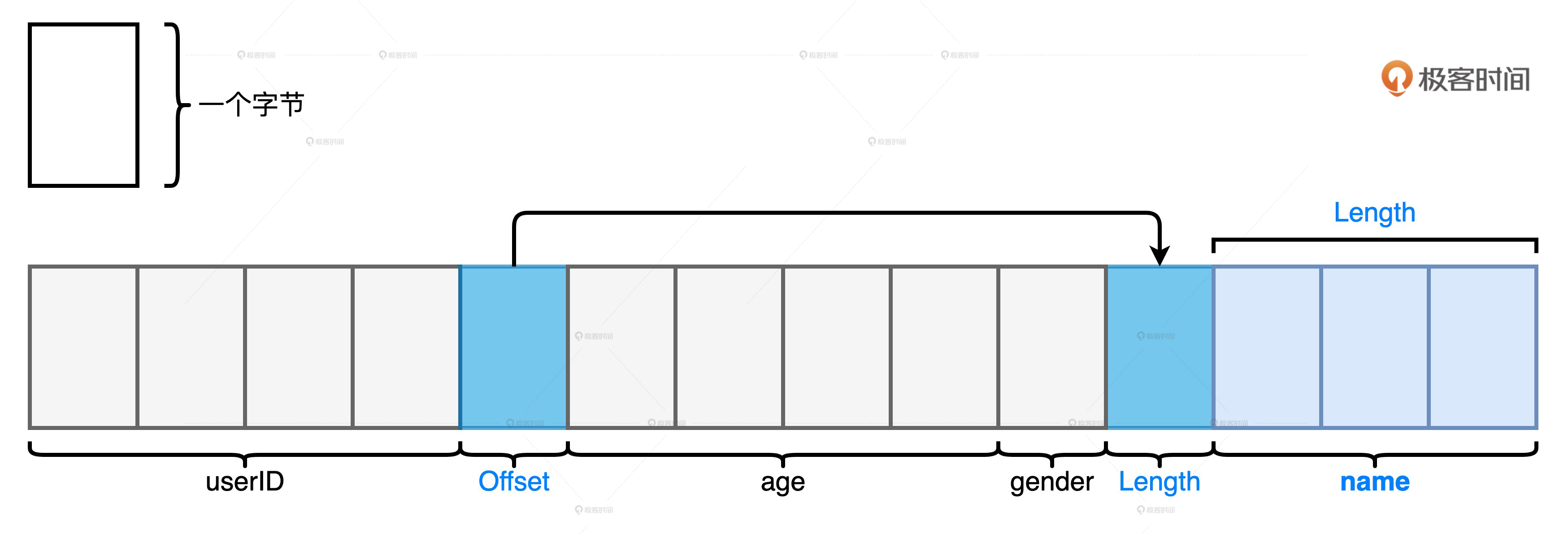 Tungsten是用二进制字节序列来存储每一条用户数据的,因此在存储效率上完胜Java Object。比如说,如果我们要存储上表中的数据,用Java Object来存储会消耗100个字节数,而使用Tungsten仅需要不到20个字节,如下图所示。
