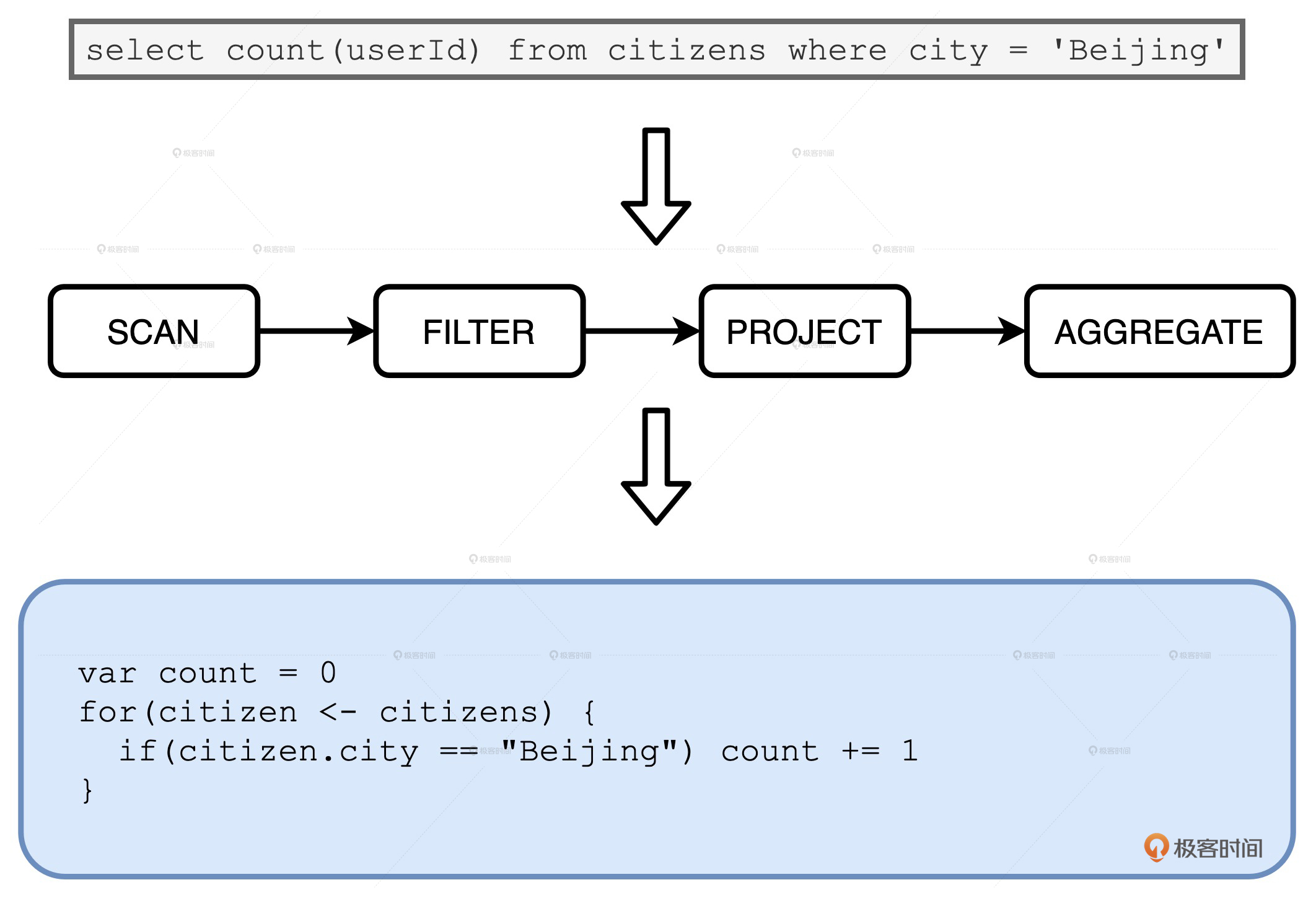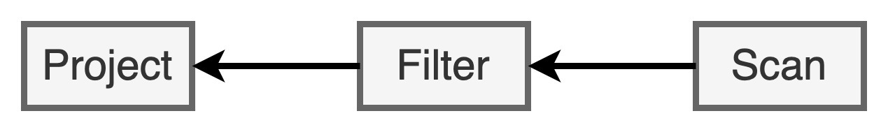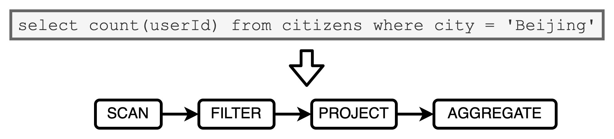 我们还是以刚刚市民表的查询为例,语法树从左到右有Scan、Filter、Project和Aggregate4个节点。不过,因为Aggregate会引入Shuffle、切割Stage,所以这4个节点会产生两个Stage。又因为WSCG是在一个Stage内部生成手写代码,所以,我们把目光集中到前三个操作符Scan、Filter和Project构成的Stage。