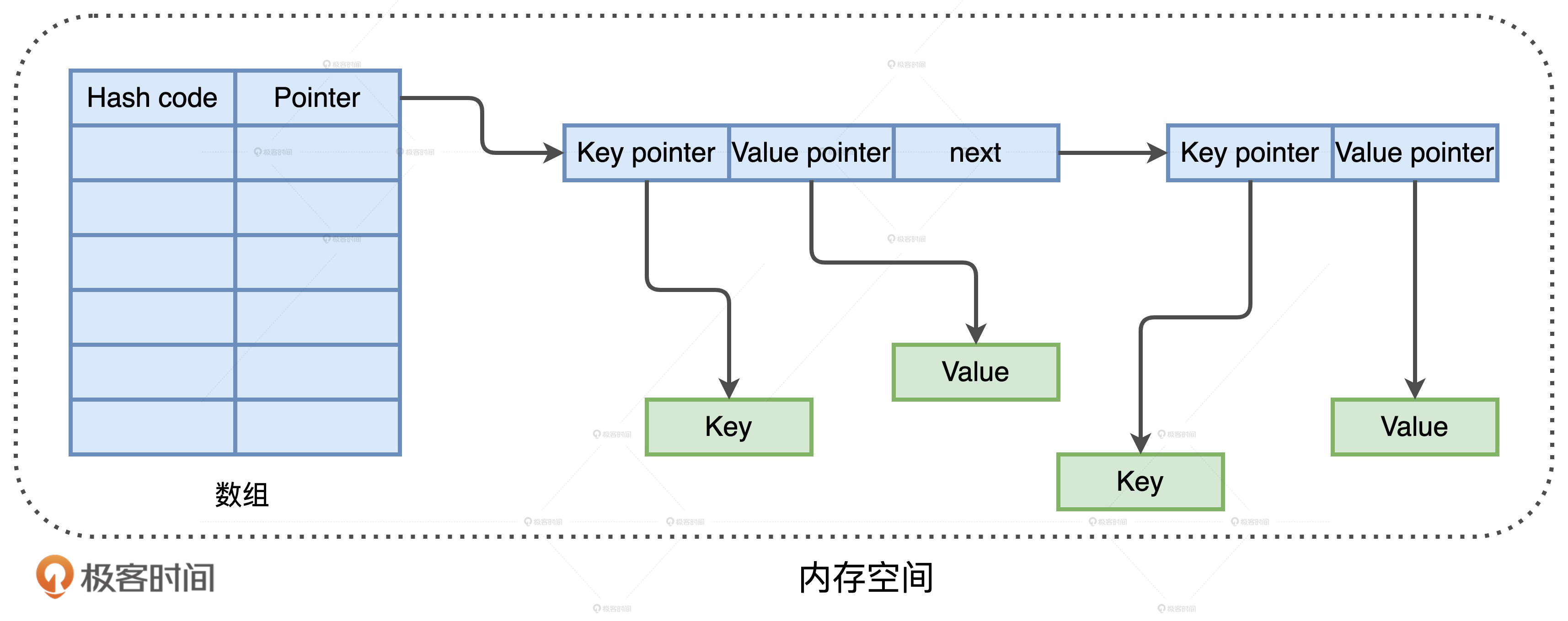 其次,在数据访问的过程中,标准库实现的HashMap容易降低CPU缓存命中率,进而降低CPU利用率。链表这种数据结构的特点是,对写入友好,但访问低效。用链表存储数据的方式确实很灵活,这让JVM可以充分利用零散的内存区域,提升内存利用率。但是,在对链表进行全量扫描的时候,这种零散的存储方式会引入大量的随机内存访问(Random Memory Access)。相比顺序访问,随机内存访问会大幅降低CPU cache命中率。