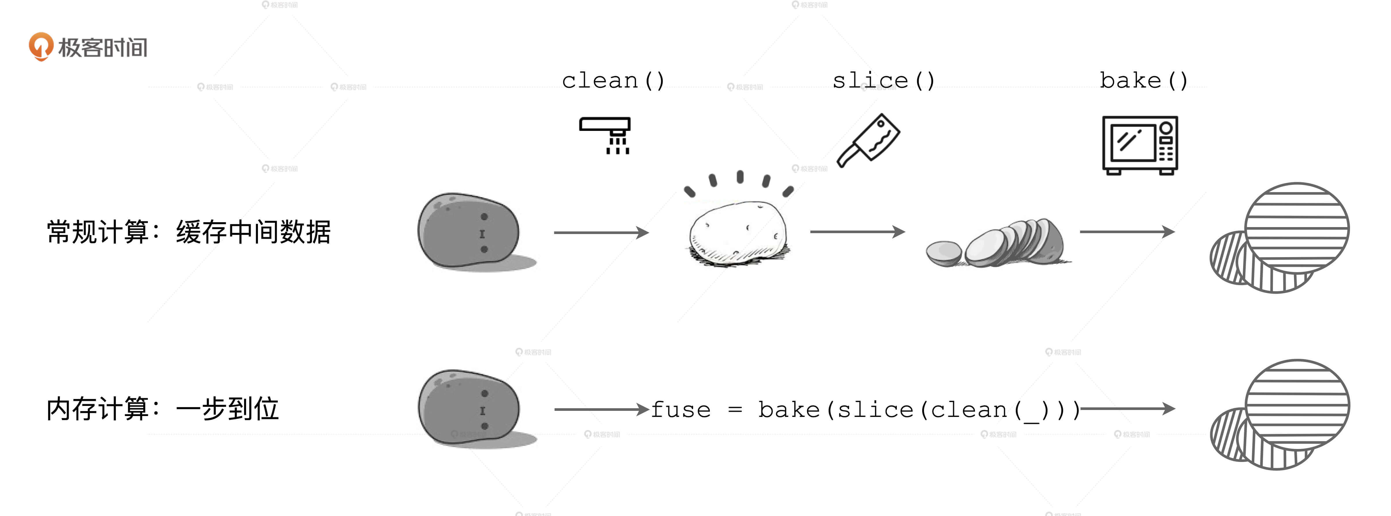接下来,我们再说说WSCG。首先,WSCG到底是什么?这就要提到内存计算的第二层含义了,它指的是在同一个Stage内部,把多个RDD的compute函数捏合成一个,然后把这一个函数一次性地作用在输入数据上。不过,这种捏合方式采用的是迭代器嵌套的方式。例如,土豆工坊中对于Stage0的处理,也就是下图中的fuse函数。它仅仅是clean、slice、bake三个函数的嵌套,并没有真正融合为一个函数。