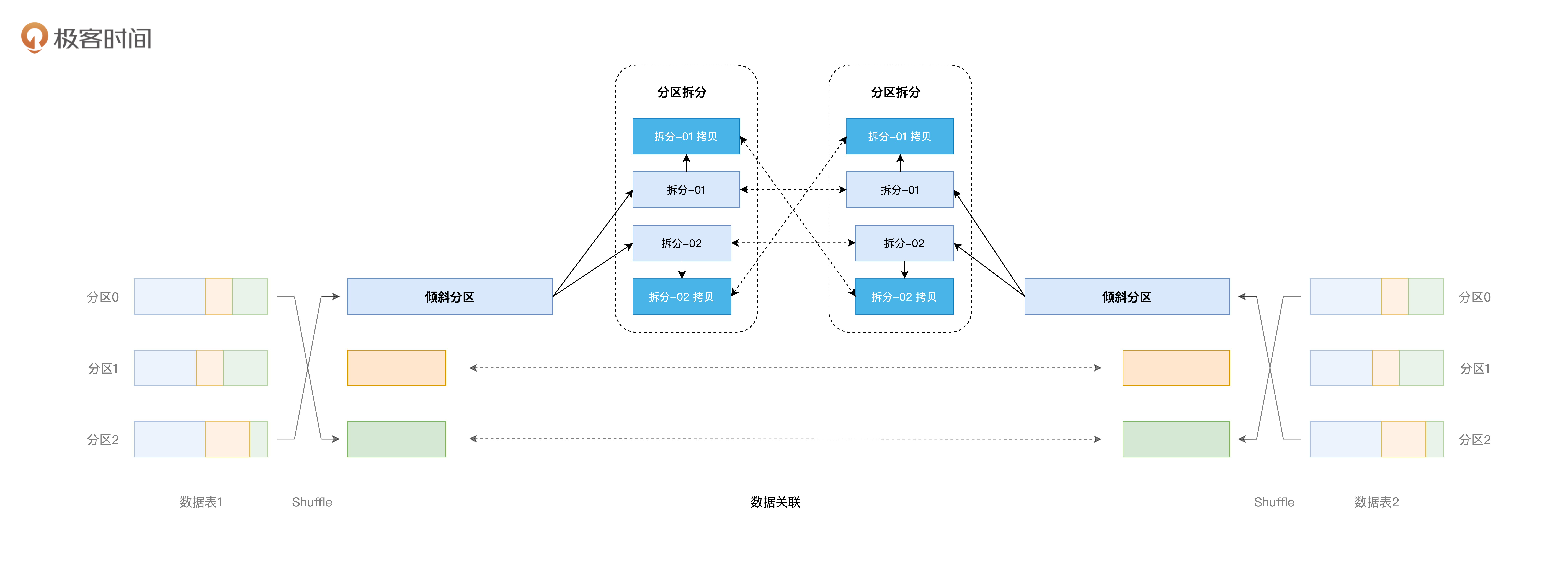 另外,在数据关联的场景中,对于参与Join的两张表,我们暂且把它们记做数据表1和数据表2,如果表1存在数据倾斜,表2不倾斜,那在关联的过程中,AQE除了对表1做拆分之外,还需要对表2对应的数据分区做复制,来保证关联关系不被破坏。