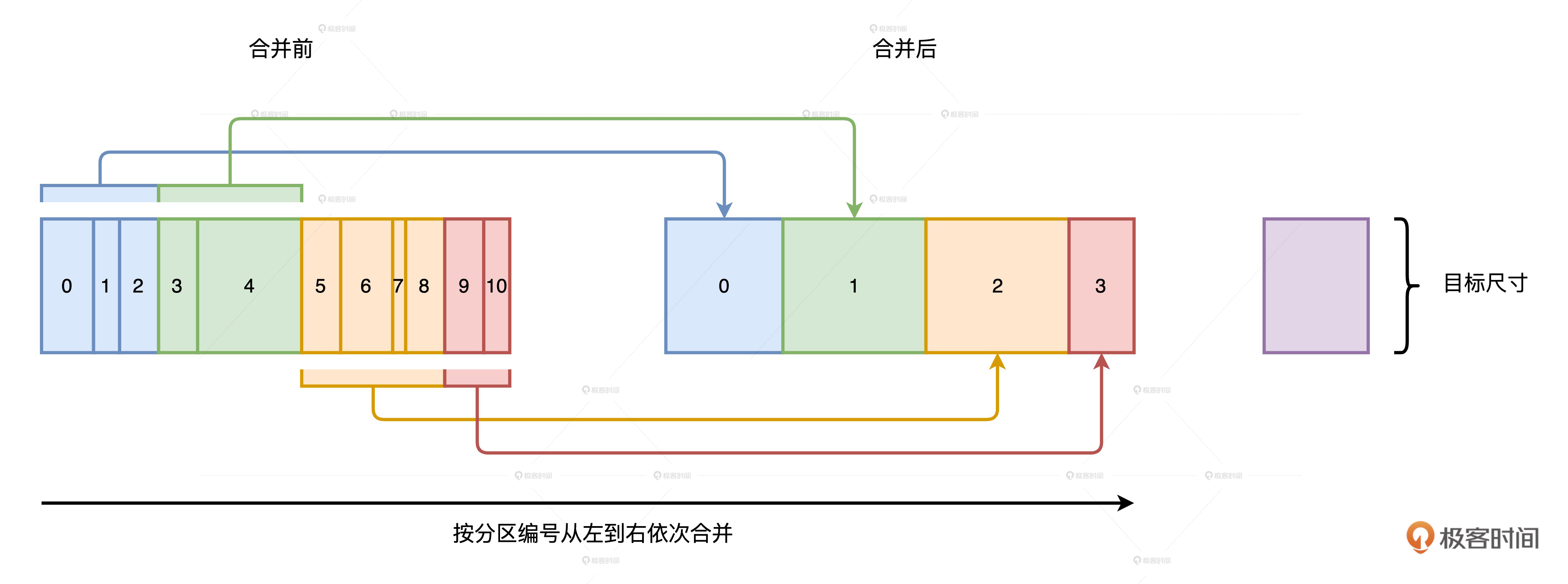 接下来,我们再来说说自动分区合并。分区合并的原理比较简单,在Reduce阶段,当Reduce Task从全网把数据分片拉回,AQE按照分区编号的顺序,依次把小于目标尺寸的分区合并在一起。目标分区尺寸由以下两个参数共同决定。这部分我们在第10讲详细讲过,如果不记得,你可以翻回去看一看。
