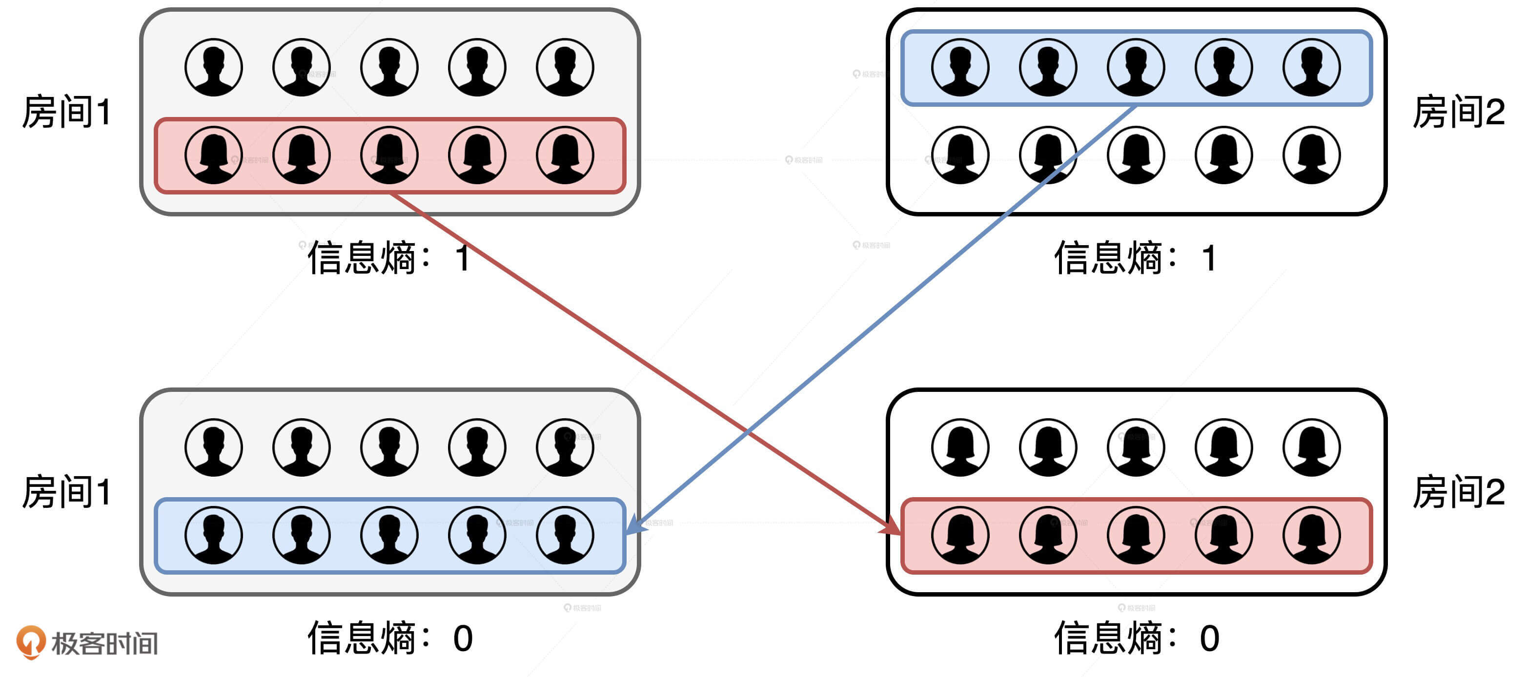 熵减听上去过于玄乎,我们来举个例子。假设有两个房间,每个房间都有5个男生和5个女生,男女比例都是1:1,如果按照性别来统计的话,那么这两个房间的信息熵都是1。然后,我们让第一个房间中所有的女生都移步到第二个房间,同时让第二个房间里所有的男生都移步到第一个房间。交换完成之后,每个房间的信息熵都降低至0。这就是一个熵减的过程,它消除了房间内“性别”这个属性的不确定性。