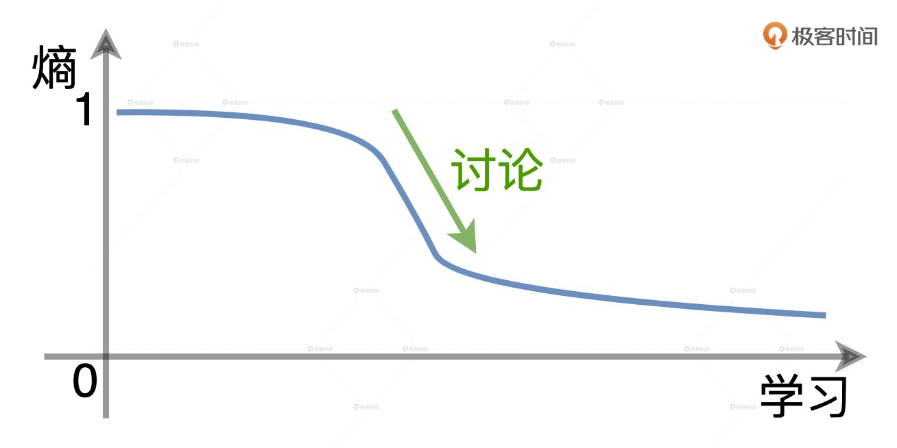 在学习的过程中,不同的方法对熵减的贡献有所不同。交流讨论对于熵减的贡献是指数级的,它是最高效的熵减途径。而这,也是我为什么一直鼓励你参与课后讨论。通过参与讨论,你可以把一些工作中未曾遇到的问题和解决办法,内化为自己的一部分,在拓展认知边界的同时,加深对于技术本身的理解。
