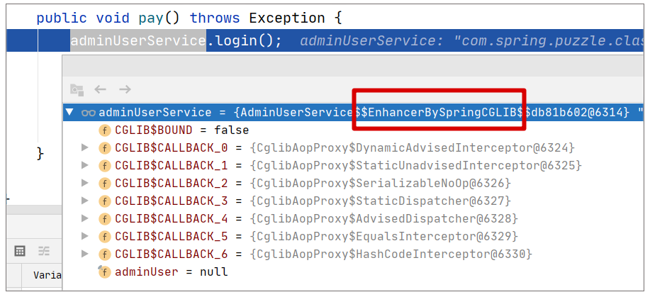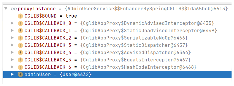 可以看出,加入AOP后,我们的对象已经是一个代理对象了,如果你眼尖的话,就会发现在上图中,属性adminUser确实为null。为什么会这样?为了解答这个诡异的问题,我们需要进一步理解Spring使用CGLIB生成Proxy的原理。