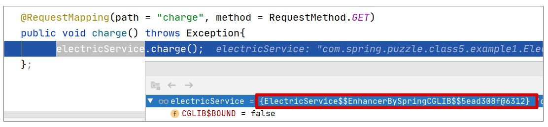 可以看到,这是一个被Spring增强过的Bean,所以执行charge()方法时,会执行记录接口调用时间的增强操作。而this对应的对象只是一个普通的对象,并没有做任何额外的增强。