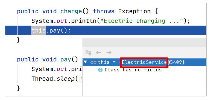 在这个电费充值方法charge()中,我们会使用支付宝进行充值。因此在这个方法中,我加入了pay()方法。为了模拟pay()方法调用耗时,代码执行了休眠1秒,并在charge()方法里使用 this.pay()的方式调用这种支付方法。