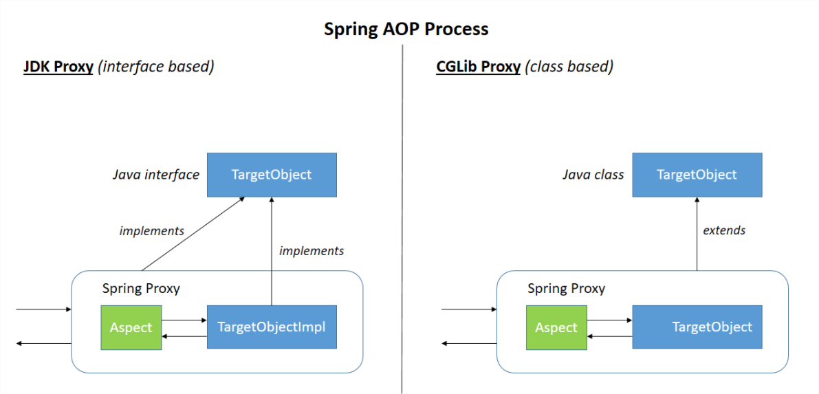 Spring AOP的底层是动态代理。而创建代理的方式有两种,JDK的方式和CGLIB的方式。JDK动态代理只能对实现了接口的类生成代理,而不能针对普通类。而CGLIB是可以针对类实现代理,主要是对指定的类生成一个子类,覆盖其中的方法,来实现代理对象。具体区别可参考下图: