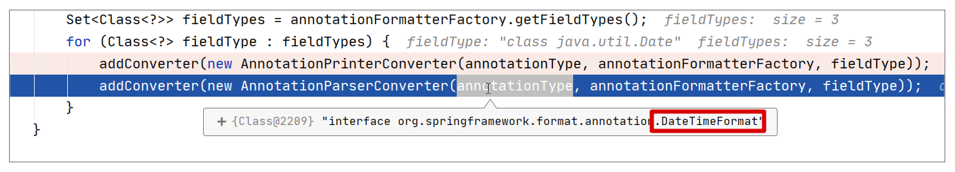 这是因为 AnnotationParserConverter 有目标类型的要求,这点我们可以通过调试角度来看下,参考 FormattingConversionService#addFormatterForFieldAnnotation 方法的调试试图:
