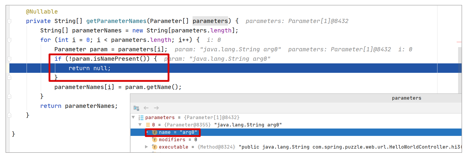 实际上就是 @RequestParam 的相关信息,我们调试下,就可以验证这个结论,具体如下图所示: