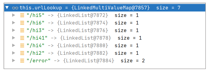 这个步骤执行的代码语句是”this.mappingRegistry.getMappingsByUrl(lookupPath)“,实际上,它是查询 MappingRegistry#urlLookup,它的值可以用调试视图查看,如下图所示: