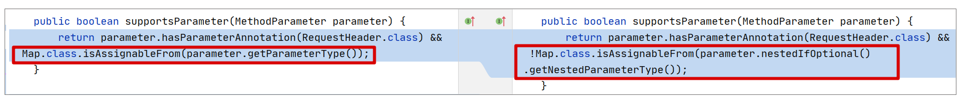 对于一个 Header 的解析,主要有两种方式,分别实现在 RequestHeaderMethodArgumentResolver 和 RequestHeaderMapMethodArgumentResolver 中,它们都继承于 AbstractNamedValueMethodArgumentResolver,但是应用的场景不同,我们可以对比下它们的 supportsParameter(),来对比它们适合的场景: