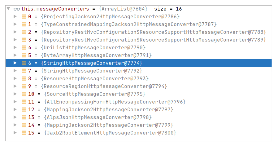 实际上这里最终使用的是 MediaType#TEXT_PLAIN。这里还需要补充说明下,没有选择 JSON 是因为在都支持的情况下,TEXT_PLAIN 默认优先级更高,参考代码 WebMvcConfigurationSupport#addDefaultHttpMessageConverters 可以看出转化器是有优先顺序的,所以用上述代码中的 getProducibleMediaTypes() 遍历 Converter 来收集可用 MediaType 也是有顺序的。