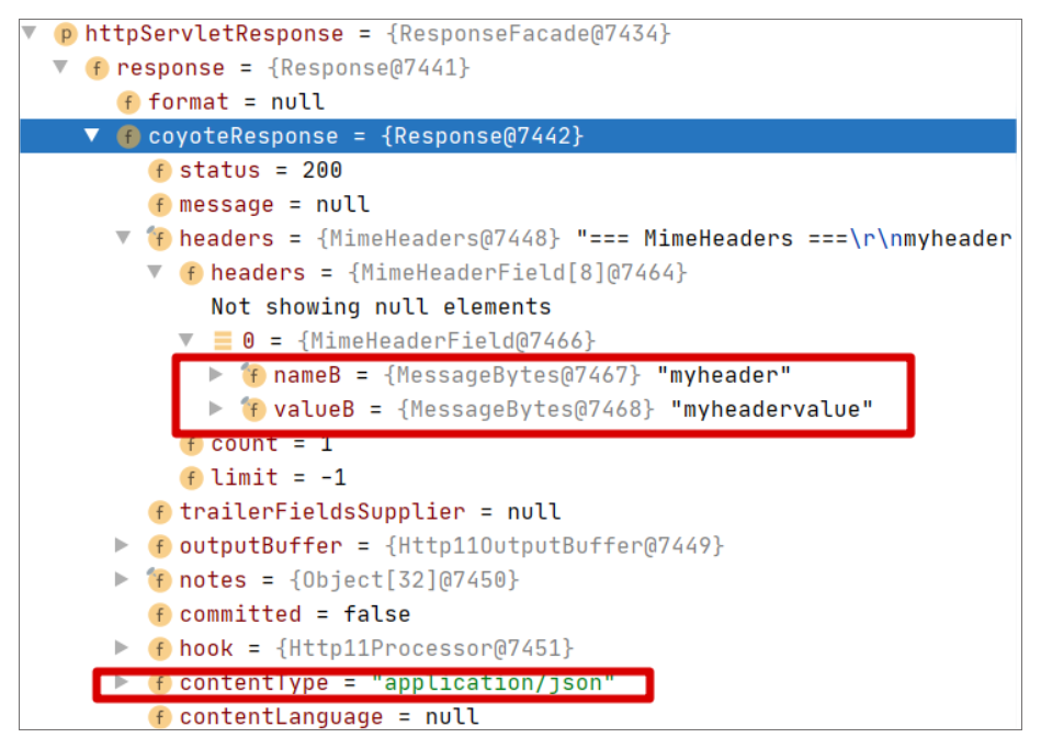 从上图可以看出,Headers 里并没有 Content-Type,而我们设置的 Content-Type 已经作为 coyoteResponse 成员的值了。当然也不意味着后面一定不会返回,我们可以继续跟踪后续执行。