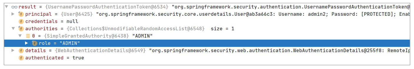在上述代码中,prefix 是 ROLE_(默认值,即 SecurityExpressionRoot#defaultRolePrefix),Roles 是待匹配的角色 ROLE_ADMIN,产生的 defaultedRole 是 ROLE_ADMIN,而我们的 role-set 是从 UsernamePasswordAuthenticationToken 中获取到 ADMIN,所以最终判断的结果是 false。