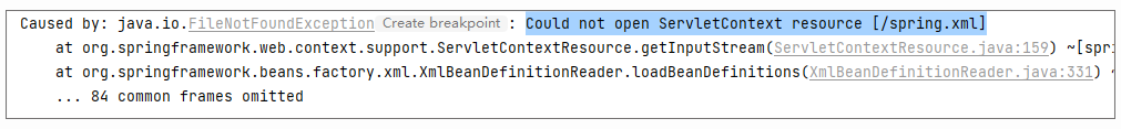 所以,最终我们在所有的目录中都找不到spring.xml,并且会报错提示加载不了文件。报错的地方位于 ServletContextResource#getInputStream 中: