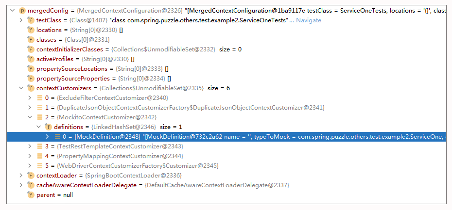 创建的过程是由 DefinitionsParser 来解析这个测试 Class(例如案例中的 ServiceOneTests),如果这个测试 Class 中包含了 MockBean 或者 SpyBean 标记的情况,则将对应标记的情况转化为 MockDefinition,最终添加到 ContextCustomizer 中。解析的过程参考 DefinitionsParser#parse:
